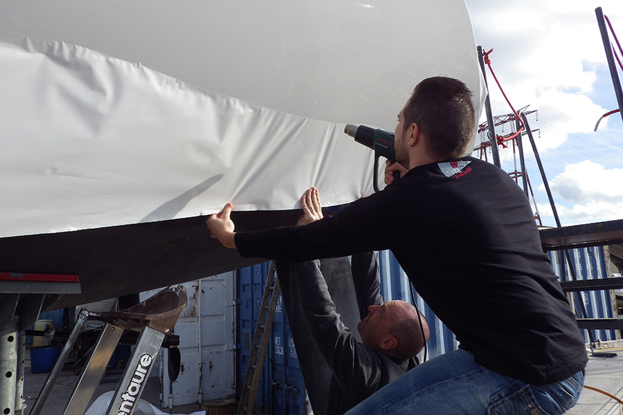 Ce procédé consiste à modifier l’apparence esthétique de la coque à l’aide d’un film adhésif permettant de réaliser une décoration unique pour un coût nettement moins élevé qu’une peinture. La pose du sticker protègera votre bateau aussi bien qu’un Gelcoat.